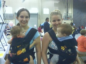 They are sporting the snazzy Ellaroo Mei Tai. And if you decide you like, get Kelly’s (on right) email–she has a couple of NIB ones for sale…