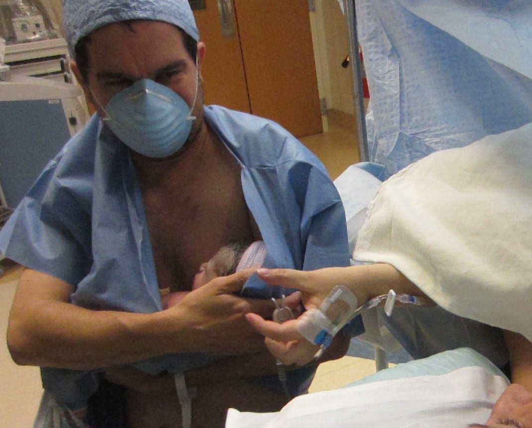 So, who’s this guy? He’s the pediatrician on call. Typically, the pediatrician or neonatologist examines the baby in the warmer immediately after birth. When he walks in, Dr. Harris tells him, “Mom would like immediate skin-to-skin with her baby.” And he says, “Fine by me.”
