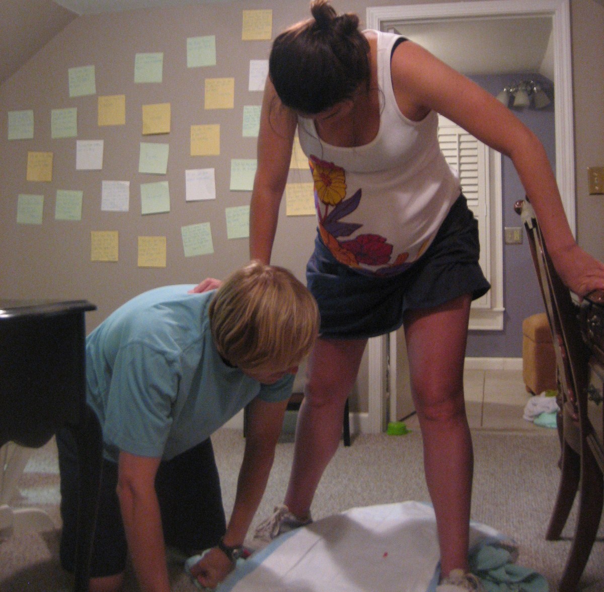 We called Julie, but told her that she did not need to come yet and that we would call her back in an hour.  Tyler woke my parents and they took Preston to Tyler’s parent’s house.  My Mom knew of the homebirth, but I had just informed my Dad that evening when I thought I was in labor.  I knew he would worry, but once again my Dad surprised me and handled it beautifully.  I guess he trusts his “little Miss Magic”.  At 3:00 am Tyler called Julie back and told Julie to call Carey.  Julie had already gotten her gear together and was on her way.  My Pressure waves were strong and very close.  I hummed during waves, yes I sounded like a dwarf from Snow White [note from Julie:  the “hi-ho, hi-ho, its off to work we go” song], but you know that is what I love about a natural birth, if you let yourself go and let your body lead you, it does things to get you through birth.  And my body apparently wanted me to hum, and so hum I did.  I told Tyler to get my “Birthing Outfit”.  Yes I like to look cute when I deliver!  My birthing attire was a knit skirt and tank and most important my Nike’s.