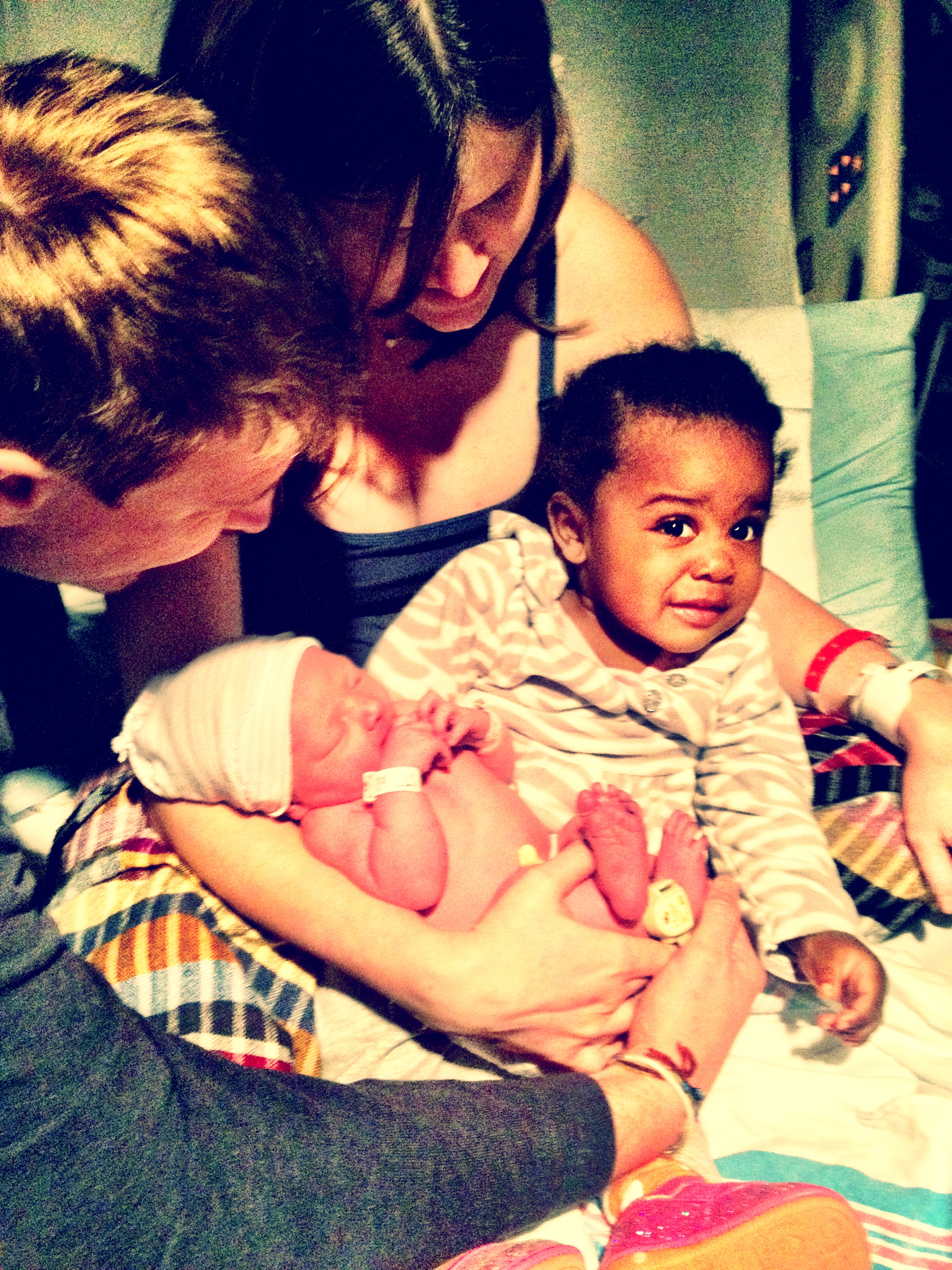 Around 10 am, the midwife used the doppler to get the baby’s heartbeat. They had been trying to do this for a while, but I was shaking so much that they couldn’t get a good reading. She told me that I needed to get the baby out soon or she was going to have to get a doctor. I knew I did not want this, but I also didn’t know what I could do differently. I laid on my back and pulled my knees back toward me. I began pushing without stopping. I felt lots of burning and the most intense pressure I had ever felt. Nate was saying, “I can see her head” and the midwives were saying, “keep pushing.” It felt like my body was exploding. I looked down and saw her head coming out. It was so purple and long! It was the most unbelievable thing I had ever seen. There was a BABY coming out of me. The midwife laid the baby on my chest and then went back to working on getting the placenta out of me. I did not have to push anything out – the afterbirth just slid out. I had a small tear, so she stitched me up quickly. I was in shock at this point and could not understand what had just happened. I kept looking at the baby on my chest in disbelief. Nate was standing next to me and we were both just dumbfounded.