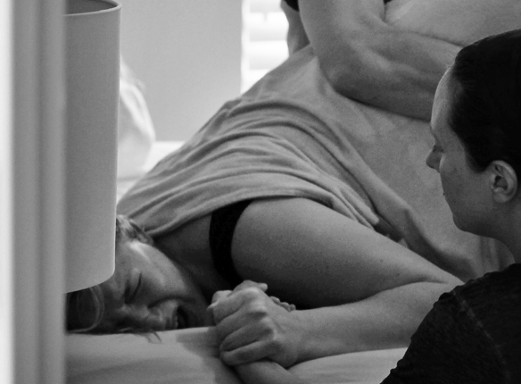 The contractions were also now very intense. Being in such a position, my way to not push/make it through them was to power-yell and have Daniel squeeze my hips. I also crushed Julie’s hand. (Actually, I squeezed it so hard that her hand had purple marks for the next several days.)