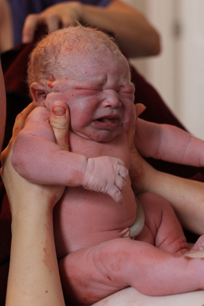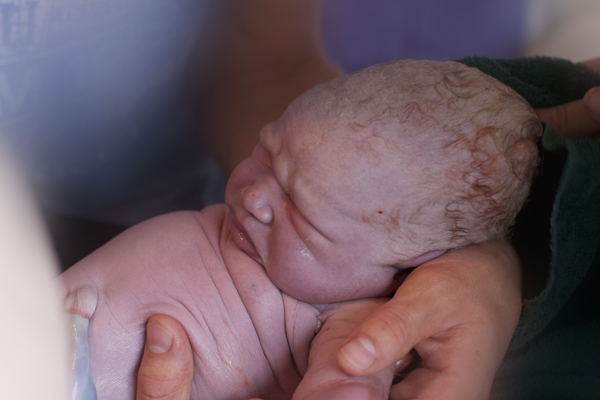 Finally, 4 minutes later, the rest of the body was born at 2:14p.m., into Daniel’s waiting hands. Justus came out with a very pale body and a purple head. His muscle tone was very weak, and his initial Apgar was just a 6. But he quickly pinked up, started breathing well, and quickly was a very red baby.
