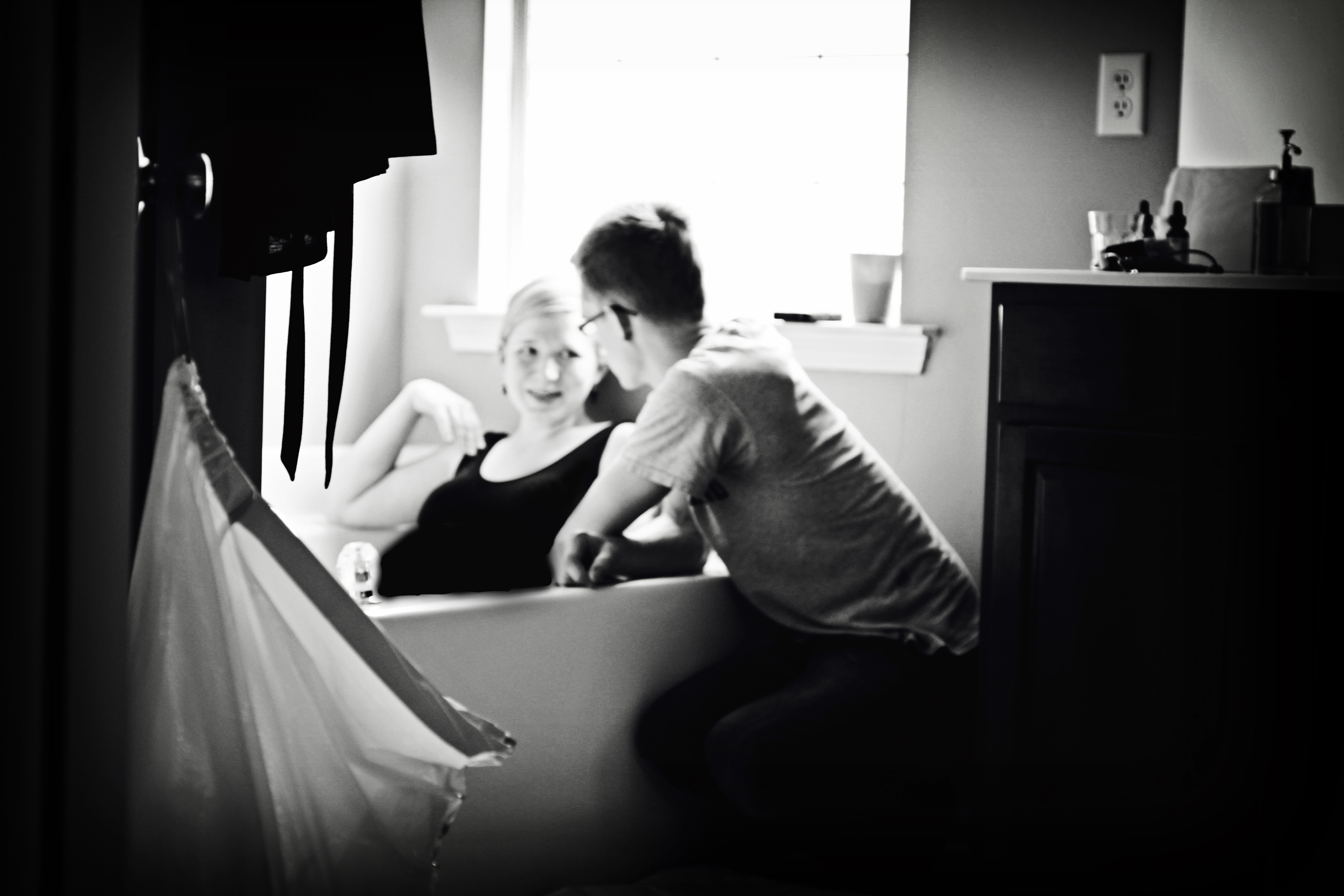 Daniel donned swim shorts and joined me in the tub. There, he worked to squeeze my hips and give me counter pressure. (Counter pressure was an amazing way to work with contractions–highly recommended!)