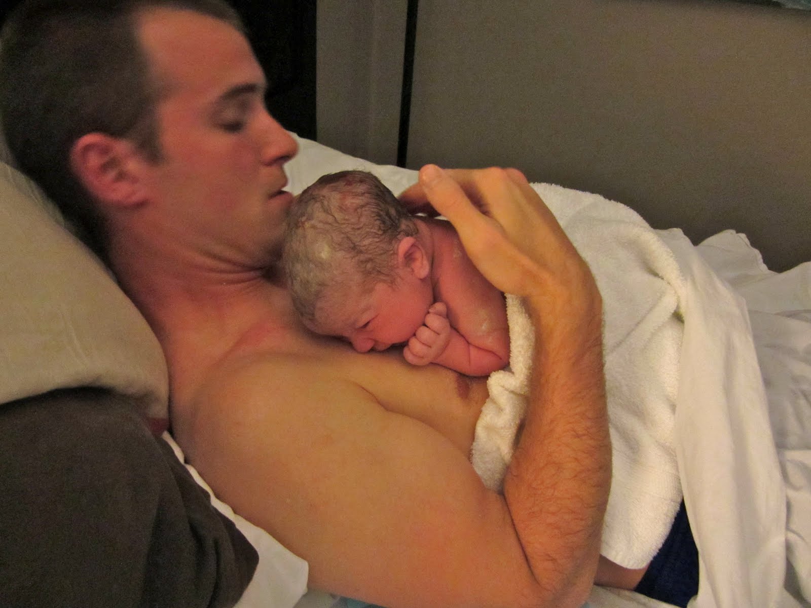 Daddy having skin to skin time with his new daughter.