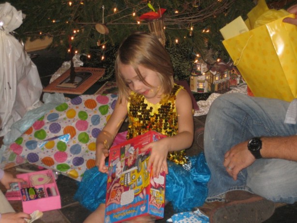 We had a small family party this year. Just as the guests were arriving, she bolted to her room, locked the door, and re-emerged wearing the shiny ensemble you see here. Complete with ruby red slippers.