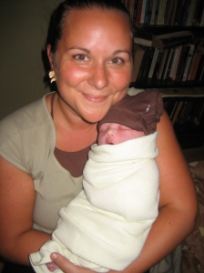 In other news, I’ve been pooped on 4 times and peed on 3 times.  I’ve realized I need more nursing tanks.  I spend most of my day nursing.  I’m writing this blog entry with a sleeping baby snuggled to my chest in a Moby wrap.  I love it.