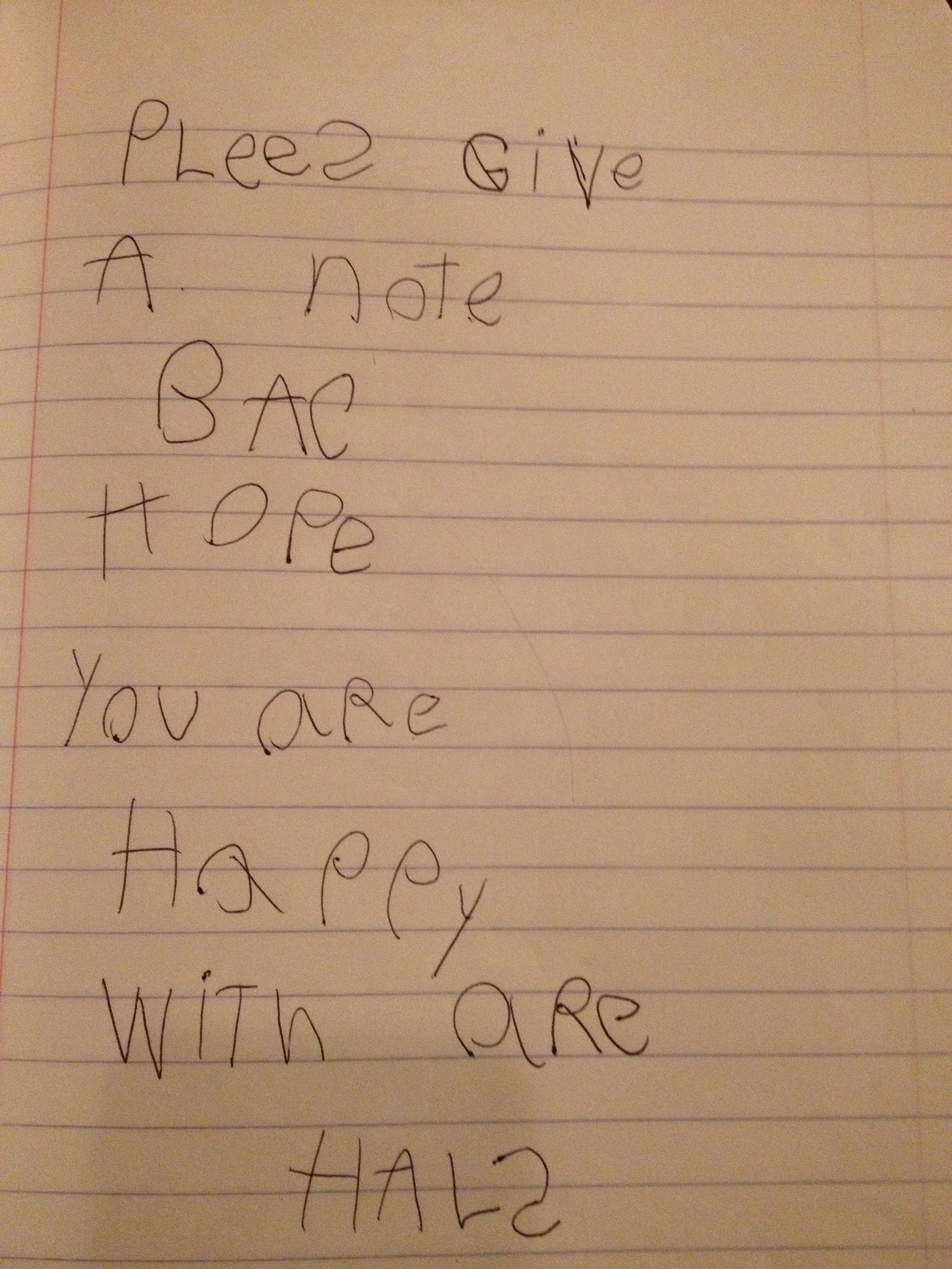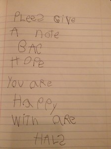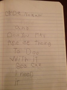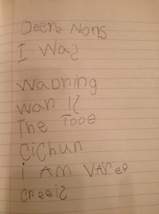 Please keep in mind that Norah is very new to writing letters. In fact, this month marks the beginning of her willingness to try. Before, she was too worried about mistakes. I told her (back when Barbie disappeared) that gnomes read by sounding out letters. They didn’t know “correct” spelling. Suddenly, she was writing letters and even a few books! Yeah, one of my finer ideas. I’ll post the three-page letter and then I’ll post the translation under each page.