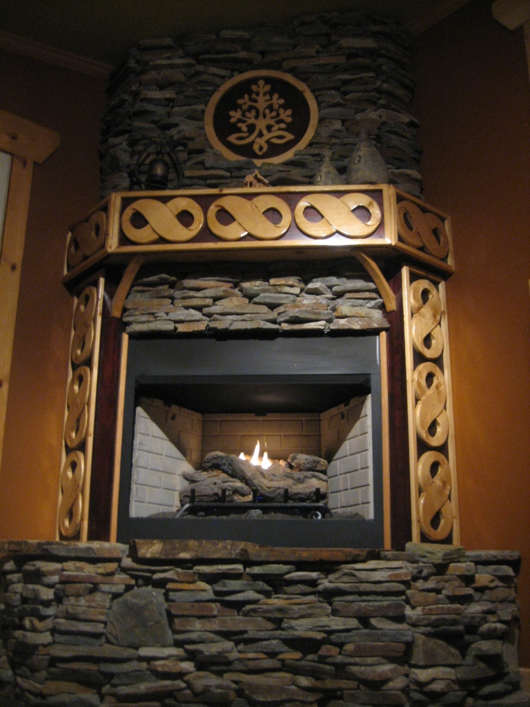 Our completed fireplace.  My husband was determined not only to make most of our Christmas gifts this year but also to complete our fireplace.  He built this thing of beauty from nothing.  It was an empty corner.  He built the mantle, installed the logs, carved the designs and centerpiece, cut the rock, stacked the rock, cursed at the rock, swore he’d never mess with rock again.  And he finished it Christmas Eve.  He is a machine.  Or a superhero.  Or maybe a robot superhero.