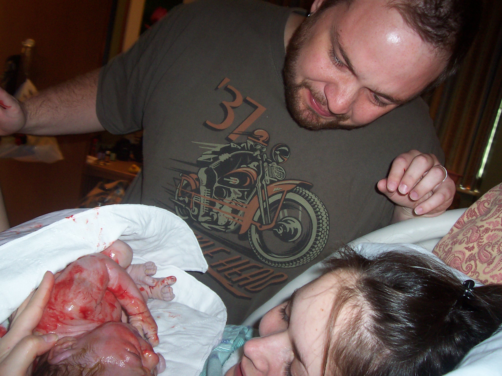 “I had a really neat delivery this AM of a really sweet couple. Mom’s 3rd baby and was laboring on her side. (I have delivered all of her babies.) When it came time to push, she stayed on her side. Baby was OP [occiput posterior–facing toward the ceiling], so it took some work for her to push it out. Dad was sitting on a chair next to bed on the side mom was facing doing very supportive, support person stuff. I was sitting on the bed, behind the mother. Because of mom’s position, as the baby was coming into view the father was as close to her perineum as I was, so he got to see his child’s birth in detail, rather than peak from up above. The really cool thing was that since the baby was OP, as it was born, it had its eyes wide open and was looking right at his father, so his father was the first person he saw instead of me. Then this baby took a big breath and began audibly crying while the head was still the only part delivered. I do not remember ever seeing that before.