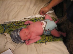 We called Julie, but told her that she did not need to come yet and that we would call her back in an hour. Tyler woke my parents and they took Preston to Tyler’s parent’s house. My Mom knew of the homebirth, but I had just informed my Dad that evening when I thought I was in labor. I knew he would worry, but once again my Dad surprised me and handled it beautifully. I guess he trusts his “little Miss Magic”. At 3:00 am Tyler called Julie back and told Julie to call the midwife. Julie had already gotten her gear together and was on her way. My Pressure waves were strong and very close. I hummed during waves, yes I sounded like a dwarf from Snow White [note from Julie: the “hi-ho, hi-ho, its off to work we go” song], but you know that is what I love about a natural birth, if you let yourself go and let your body lead you, it does things to get you through birth. And my body apparently wanted me to hum, and so hum I did. I told Tyler to get my “Birthing Outfit”. Yes I like to look cute when I deliver! My birthing attire was a knit skirt and tank and most important my Nike’s.